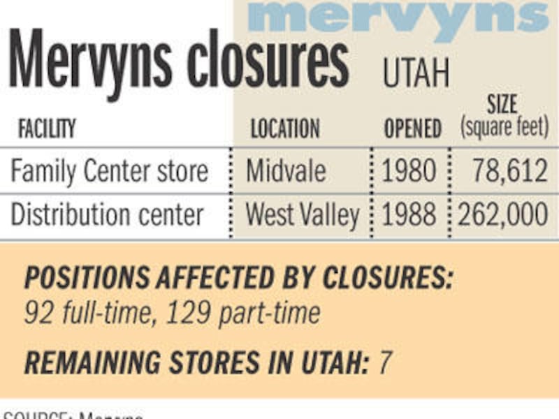 Mervyns LLC announced Wednesday that it will close its Midvale retail store and a distribution center located in West Valley City, eliminating 92 full-time and 129 part-time jobs.