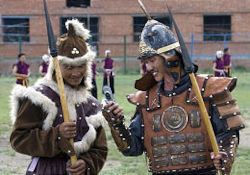 Mongolian men dressed as traditional Mongol warriors check out the camera on a cell phone during rehearsals Friday for the Naadam festival in Ulan Bator, Mongolia. The festival marks 800 years since Genghis Khan inspired terror on two continents. Mongolians are celebrating the great conqueror by renaming the Mongolian capital's airport after him and building a $5 million statue of the Great Khan and his sons in the city's central square.