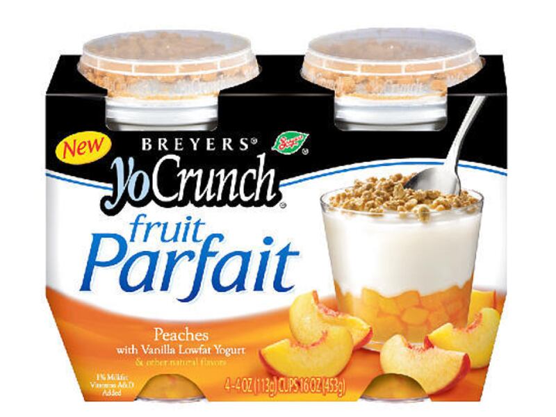 Breyers YoCrunch Fruit Parfait. Strawberry, Blueberry, and Peach. $2.89 per package of four, 4-ounce cups.