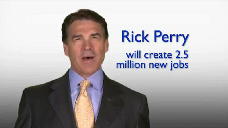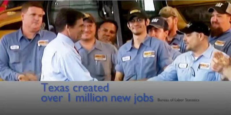 Perry has campaigned for more than two months on the ad's central premise: That Texas has added 1 million jobs in his decade as governor and that he is due a significant share of the credit for his administration's agenda of lower taxes, reduced regulation and limits on lawsuits. Perry's chief rival, Mitt Romney, attributes the growth largely to Texas' luck at having an oil and gas industry. Employment in that industry has grown by 60 percent during Perry's tenure.