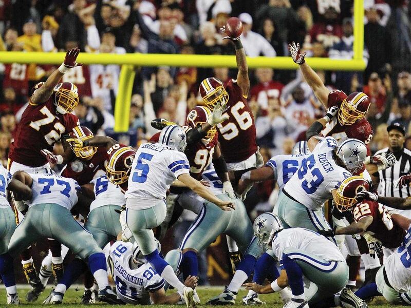 Notes: Redskins LT Trent Williams hurt the MCL in his left knee on the missed overtime field goal. Coach Mike Shanahan said the injury "didn't look very good." Washington was already using its fifth starting offensive line configuration in six weeks. ... Redskins CB Josh Wilson left with a hamstring injury. S LaRon Landry was inactive with an ailing left Achilles tendon, and rookie LG Maurice Hurt was out with a knee injury. ... Dallas has won six of seven vs. Washington.