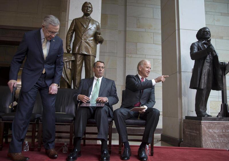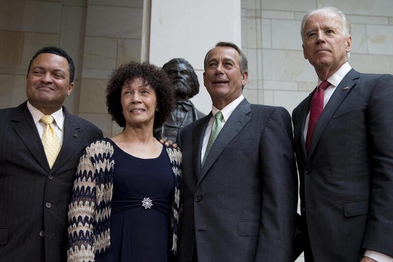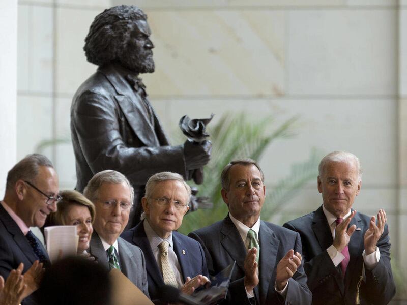 Biden, along with Democratic Sen. Harry Reid and Democratic Del. Eleanor Holmes Norton, used the U.S. Capitol ceremony to call for equal voting rights for citizens of the District of Columbia — an issue dear to Douglass' heart.