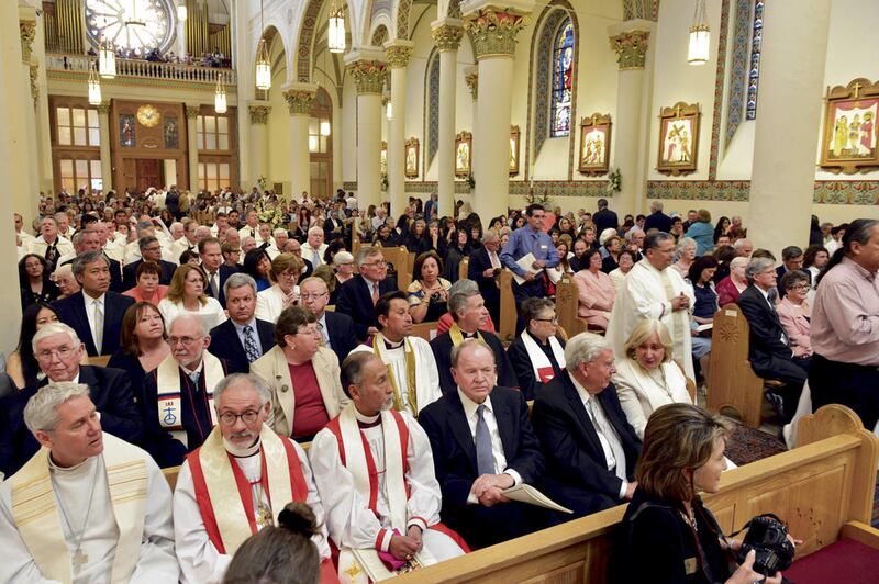 By 1:50 p.m., the cathedral bells began ringing and members of the clergy were lined up two-by-two. Archbishop Sheehan walked up and down the line, shaking hands and hugging some old friends.