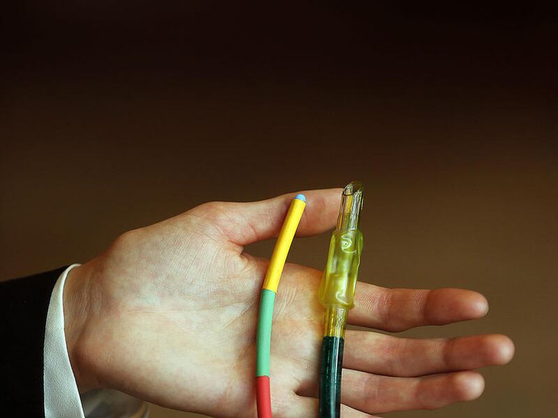 Through the Cords has developed a steerable introducer, which allows a provider to wind it into the windpipe correctly. A series of color-coded markers will tell them whether the tube has landed in a good spot — yellow indicates not far enough, green is a good position, and red means they've gone too far.
