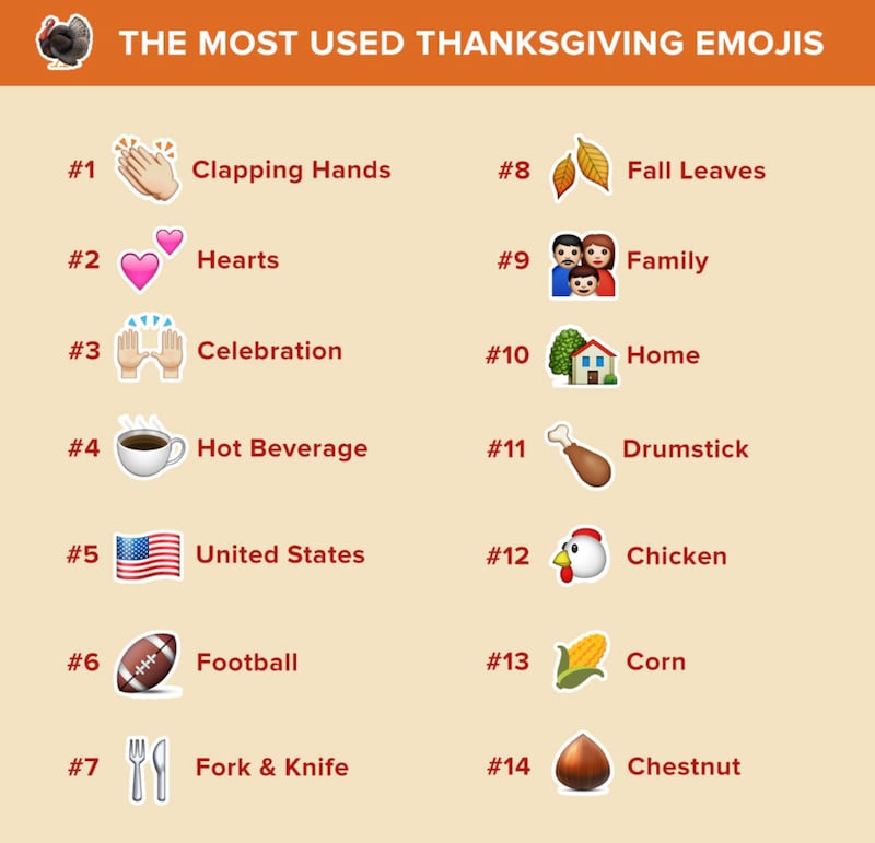 Emojipedia, the website that has definitions on all emojis, put together a list of the most-used Thanksgiving emojis shared on the holiday.