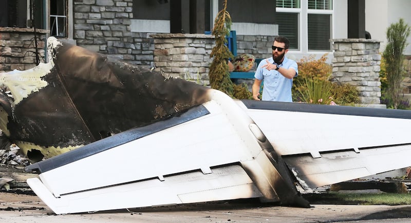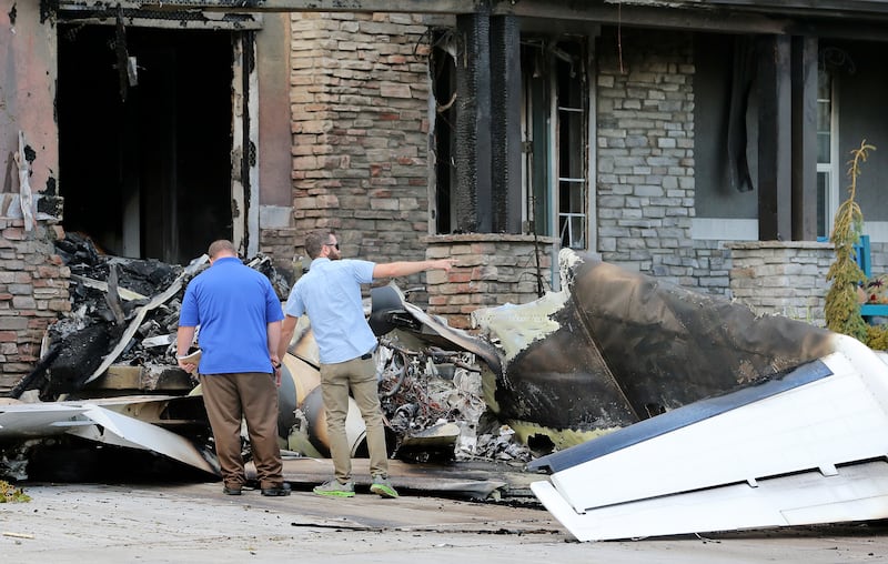 Charred remains of the plane were in front of the house Monday next to a car that was tipped onto its side. Remarkably, a good portion of the house was still standing.