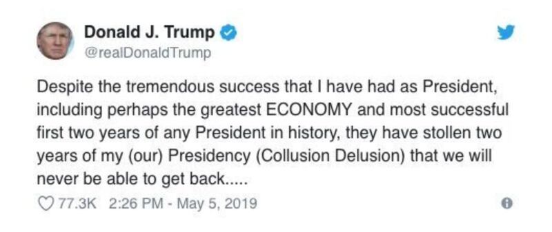 “Despite the tremendous success that I have had as President, including perhaps the greatest ECONOMY and most successful first two years of any President in history, they have stollen two years of my (our) Presidency (Collusion Delusion) that we will never be able to get back,” Trump tweeted Sunday, according to The Washington Post.
