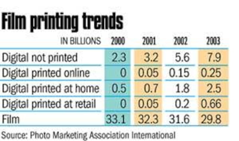 Digital shots (including those not printed or printed online, at home or at retail shops) totaled only 2.8 billion prints in 2000 but rose to 11.31 billion this year. Film use, meanwhile, has shrunk from 33.1 billion to 29.8 billion prints during that time.