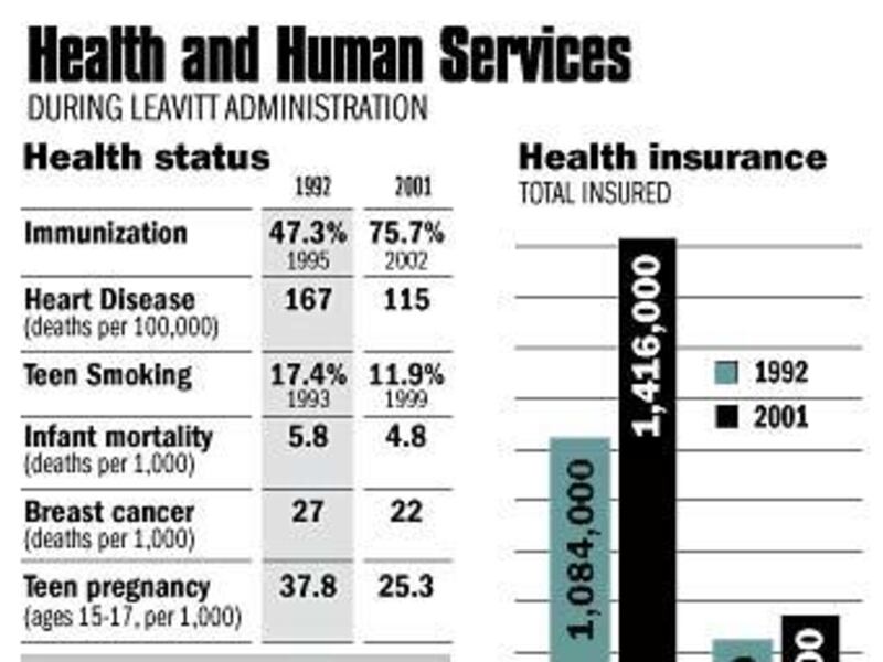 Five years ago last week, Leavitt smiled for pictures with Redmond farm kids who were the first to enroll in the new Children's Health Insurance Program. The combination federal and state plan to get all children covered by medical insurance was the first of a dozen feathers in the health-care reform cap that Leavitt happily dons looking back over his 11 years in office.