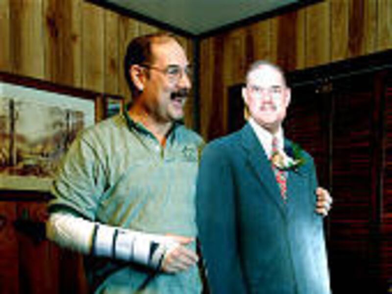 Actually, only the boutonniere was real. The figure was a nearly life-size cardboard cutout of President Bush, on which a family member had pasted a photo of Woodbrey's face. It was assembled as a stand-in, representing him at the marriage of a daughter that happened while he was serving in Baghdad.