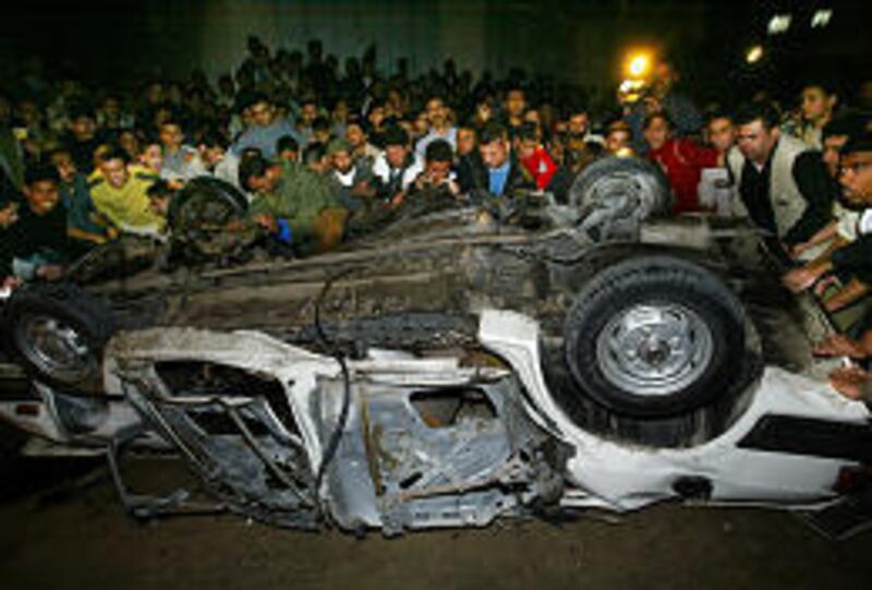 Thousands of angry Palestinians marched through the streets of Gaza City, carrying pieces of the charred car and shouting, "revenge, revenge." One man stuck his hands into the car, pulled them out covered with blood and waved them in the air.