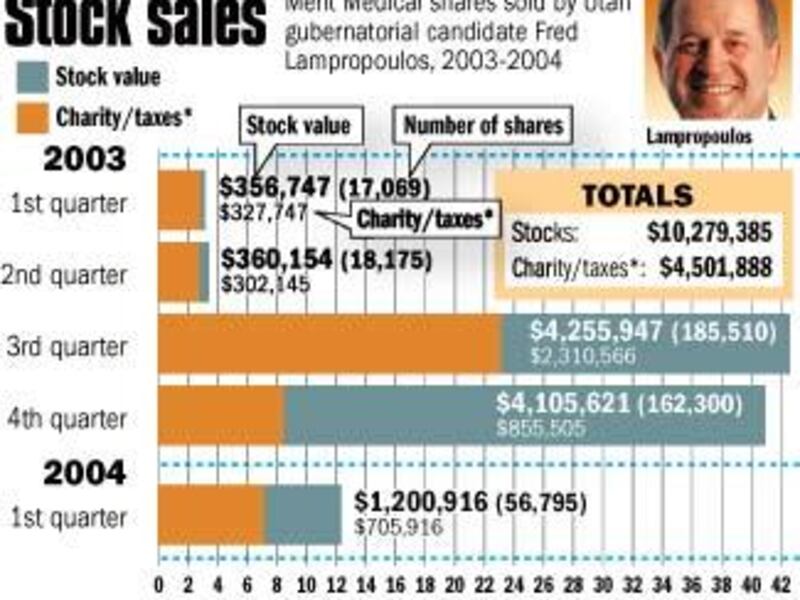 Of the $10.3 million in stock he has has sold or given away, a large portion was spent as contributions to various charities, tithes to The Church of Jesus Christ of Latter-day Saints or to pay taxes, he said. According to SEC filings, the amount of stock transferred by Lampropoulos to those various entities was $4.5 million since January 2003.