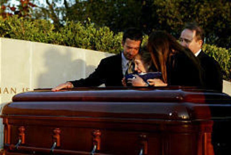 After maintaining her composure in public all week, Nancy Reagan dissolved into tears after receiving the carefully folded flag that had encased her husband's casket. She rested her head on the coffin and cried softly while her children and her stepson, Michael Reagan, tried to comfort her.