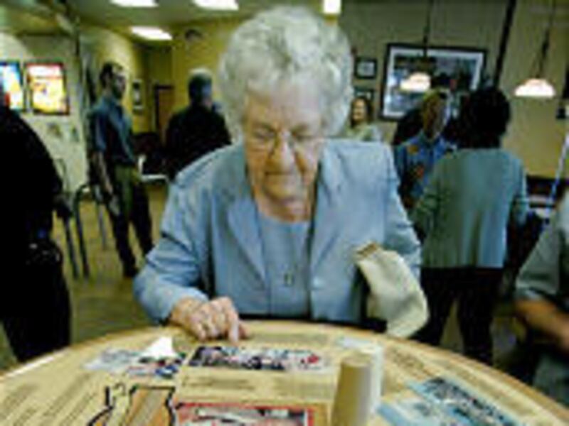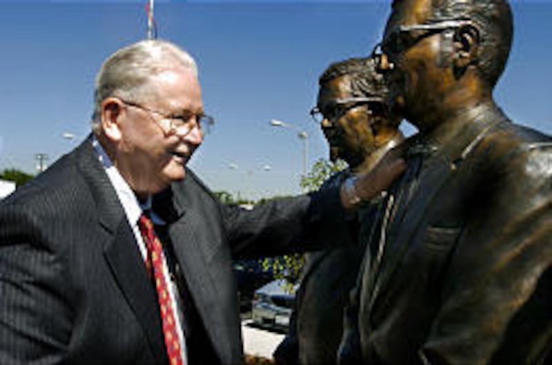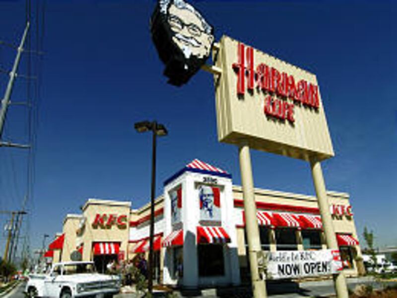 Left, the world's first Kentucky Fried Chicken restaurant at 3900 S. State in Salt Lake City was torn down in April, but a new KFC has taken its place offering more seating, more parking and memorabilia. Below left, 85-year-old Pete Harman (co-founder of KFC) examines the statue of him and Colonel Harland Sanders. Below right, Vernell Anderson, wife of Don Anderson, the Salt Lake painter who came up with the name "Kentucky Fried Chicken," reads about the restaurant's history. In August 1952, Harman began selling Sanders' crispy fried chicken.