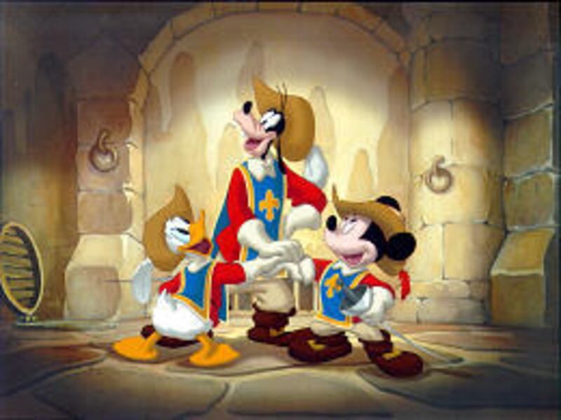 "The Three Musketeers" (Disney, 2004, G, $29.99). This new hourlong cartoon stars Mickey Mouse, Goofy and Donald Duck as three bungling janitors who aspire to be Musketeers. They eventually achieve their dream, unaware that evil Peg-Leg Pete has actually elevated their status to facilitate his plot to overthrow Queen Minnie and become king.
