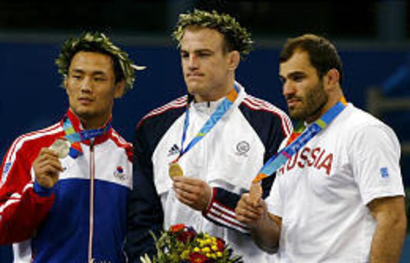 ATHENS — They stood at opposite ends of the Olympic wrestling hall. On the end with the podium, standing at attention on the top step and wearing an olive wreath as Olympic champion, was Cael Sanderson of Heber City, Utah.