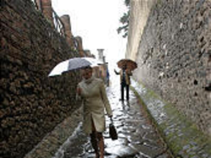 POMPEII, Italy — It was just after 1 p.m. on a cold, wet day. Four bedraggled, scholarly looking men stood under their umbrellas at the entryway to the ruins of Pompeii. Rain spattered the stones at their feet.