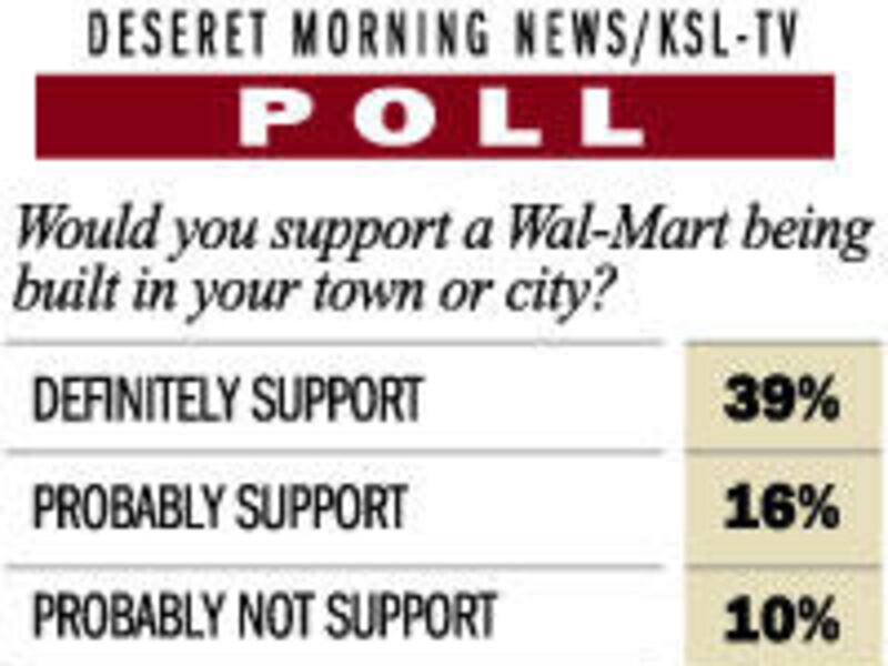 A Deseret Morning News/KSL-TV poll found 55 percent of Utahns would welcome a Wal-Mart in their city or town, even though 87 percent of respondents also said big-box retailers hurt local business. The poll, conducted Nov. 29-30, surveyed 313 residents and has a 6.5 percent margin of error.