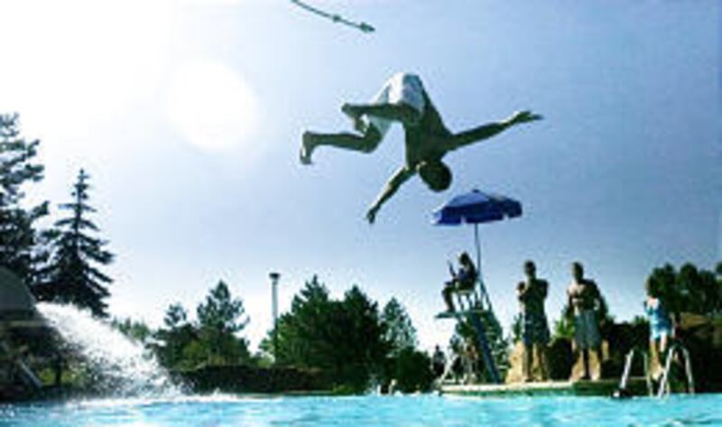 Philip Gorst flips into the air as he enjoys the pools at Raging Waters on Friday. Water parks, swimming pools, lakes, rivers, lawn sprinklers, etc., around the state may offer outdoor recreationists a brief reprieve from summer temperatures, soaring in the vicinity of 100 degrees. The coming week promises more of the scorching same, with few clouds and probably no hope of rain.