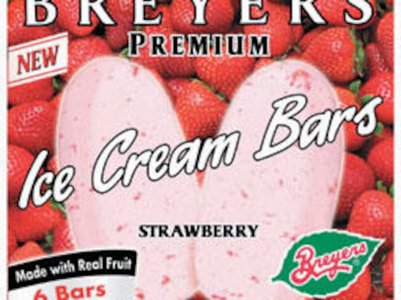 Breyers Ice Cream Bars. Strawberry, and Peach. $4.19 per 18-ounce box containing six bars.
