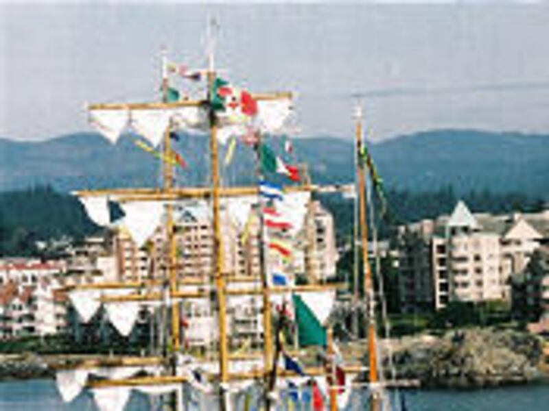 VICTORIA, B.C., Canada — Like live ornaments on huge trees, Mexican sailors manned the yardarms as their colorful ship entered James Bay with a style befitting the Tall Ships Victoria festival.