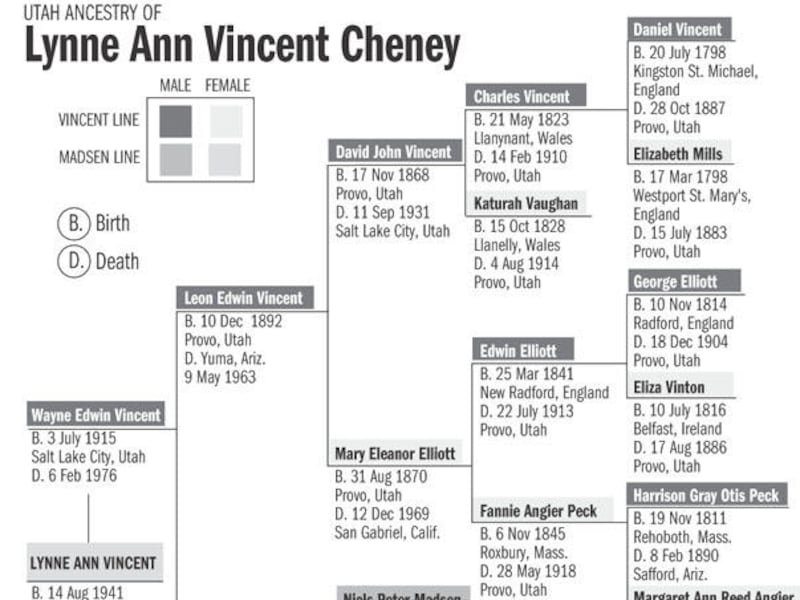 Many Utahns likely do not realize Cheney's ancestral ties to Utah or The Church of Jesus Christ of Latter-day Saints, especially because she was born and reared in Wyoming as a Presbyterian. She became a Methodist when she married.