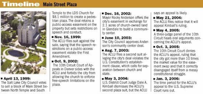 That legal battle ends today when the appeal deadline from an October court decision passes. In that decision, the 10th Circuit Court of Appeals ruled that the city acted appropriately in trading its easement — and the accompanying free-speech guarantees of the U.S. Constitution — for several acres of church property west of downtown. The ACLU and the plaintiffs it represented will not petition the U.S. Supreme Court for a hearing on the case, choosing instead to let the deadline pass quietly, said Dani Eyer, executive director of the ACLU's Utah chapter.