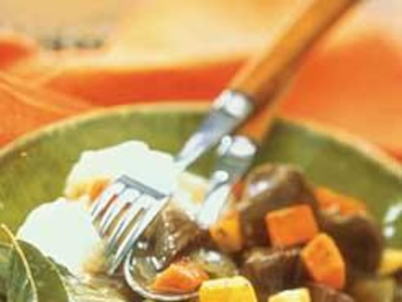 Meanwhile, prepare either fresh or instant mashed potatoes, adding 2 bay leaves to the cooking water. Serve stew over mashed potatoes. Makes 6 servings.