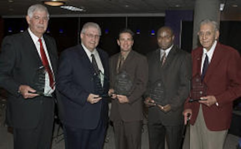 Utah Sports Hall of Fame inductees, left to right: Glen Smith (Utah basketball), Allen Jacobs (Utah football), Brad Pearce (BYU tennis), Manny Hendrix (Utah basketball) and Wilbur Braithwaite (Manti H.S. coach) pose before the Utah Sports Hall of Fame inductions on Wednesday.