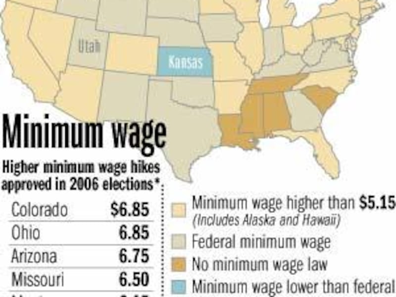As a result of the November elections, 28 states nationwide have — or will soon have — a minimum wage that's higher than the federal rate. Recently approved rates range from $6.15 an hour in Nevada to as much as $8 an hour in California beginning in 2008.