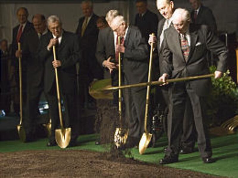 Once President Hinckley gave the dedicatory prayer on the site, he and his counselors and other general authorities took shovels to the loose dirt in front of the dais. He invited those in the audience who wanted to participate to come forward and take a shovel.