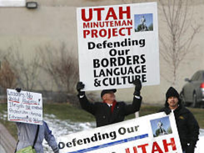 Across the street, Michelle Herzog was among a handful of Utah Minuteman Project members out to support continued crackdowns on illegal immigration. "It's very scary that our identity could be stolen by other people who are not legally in this country," she said.