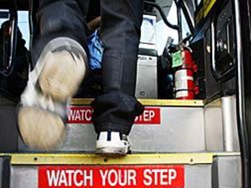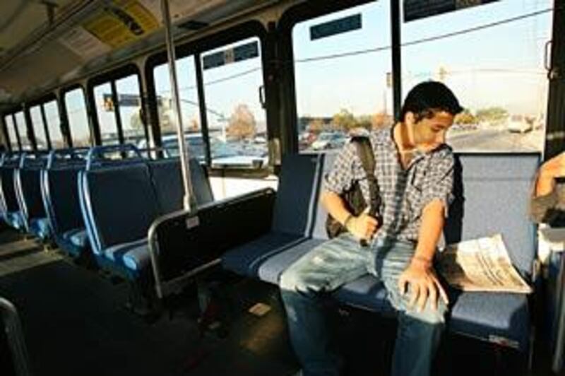 Just a few seats behind the driver sits 18-year-old David Felipe Gomez in a plaid shirt and jeans, a tiny ring piercing his lower lip. One seat away is Chris Hopkin, wearing a yellow tie and polished shoes, and he rests one leg on the seat as he scrolls through a handheld computer.
