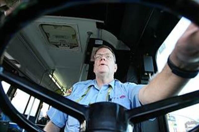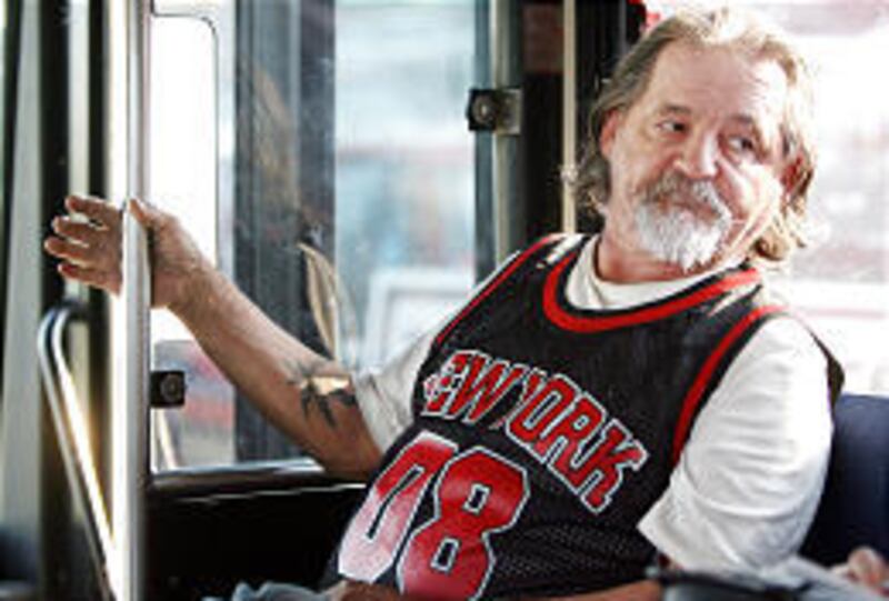 About five minutes before he's scheduled to leave at 8 a.m., Chuck Ackerson wanders outside the bus to talk with Tom Brotherson, a fellow driver who goes by "Tom Tom." Brotherson drives the 8:15 bus, just after Ackerson.
