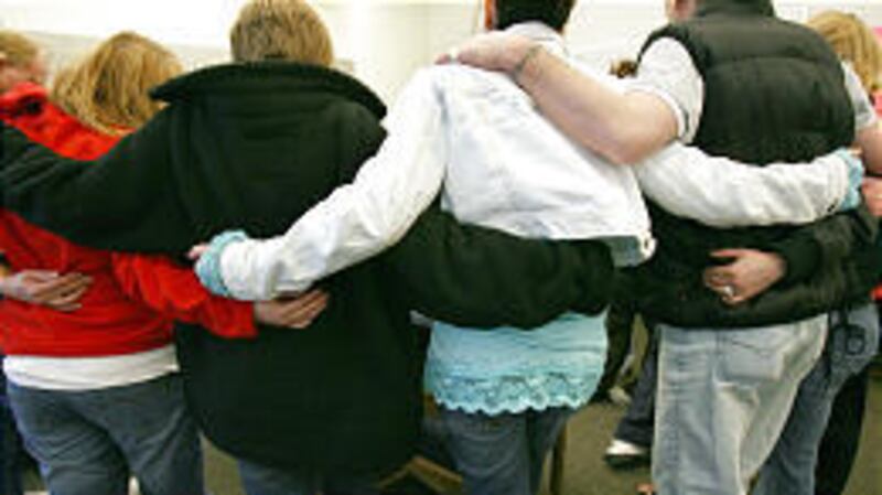 The Foothill Day Treatment session closes with the students standing in a circle, arms around each other with their right foot forward. They lean in close and repeat, with Seal, the words of a prayer.