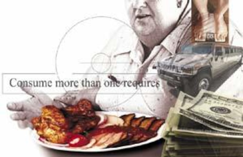Americans eat 25 percent more calories than they need, "so there is a kind of excess behavior in the culture," says professor Lloyd H. Steffen, chaplain and professor of religion studies at Lehigh University. "A glutton consumes and doesn't pay attention to the bigger picture" — in this case the effect of overeating on pollution and land use. If we buy gas-guzzling cars, we're gluttons, too, he says.