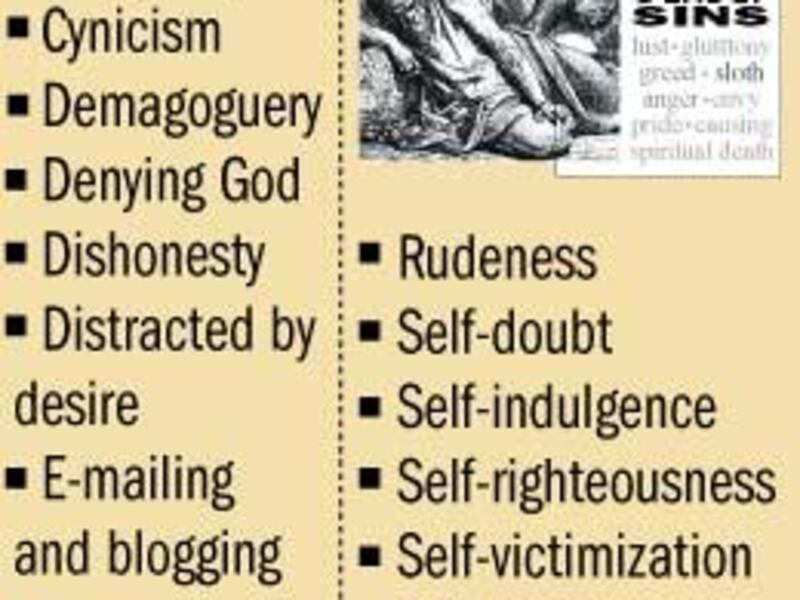 Votes also came in for, in alphabetical order: aggression, complicity (the justification of sin because someone else is doing it, as Steven J. Allison notes), cynicism, demagoguery, denying God, dishonesty and duplicity (including 'spin'), e-mailing and blogging, fear, feeling like you never have enough, hatred, ignorance, impatience, intolerance, not forgiving others, prurience and porn, self-doubt, self-indulgence, self-righteousness, self-victimization, self-worship, "the relinquishing up of one's attention to whatever glittery thing that happens to capture it," wanting immediate gratification, and wanting to make money without working for it.