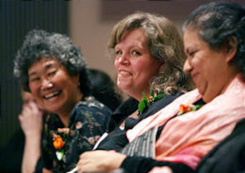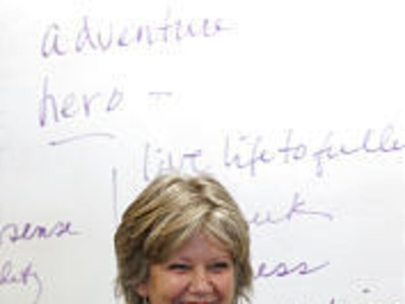 The students talk about their own writing life, how they feel like that bird sometimes, flapping their wings trying to free some thought. "I'm thinking about it all the time, wherever I am, in the shower, everywhere," says Dot Richeda about the papers she writes for her classes. At 62, Richeda is the oldest student, a woman who grew up in a Japanese family that thought women should walk two steps behind. She works as an office manager in a cheese factory.