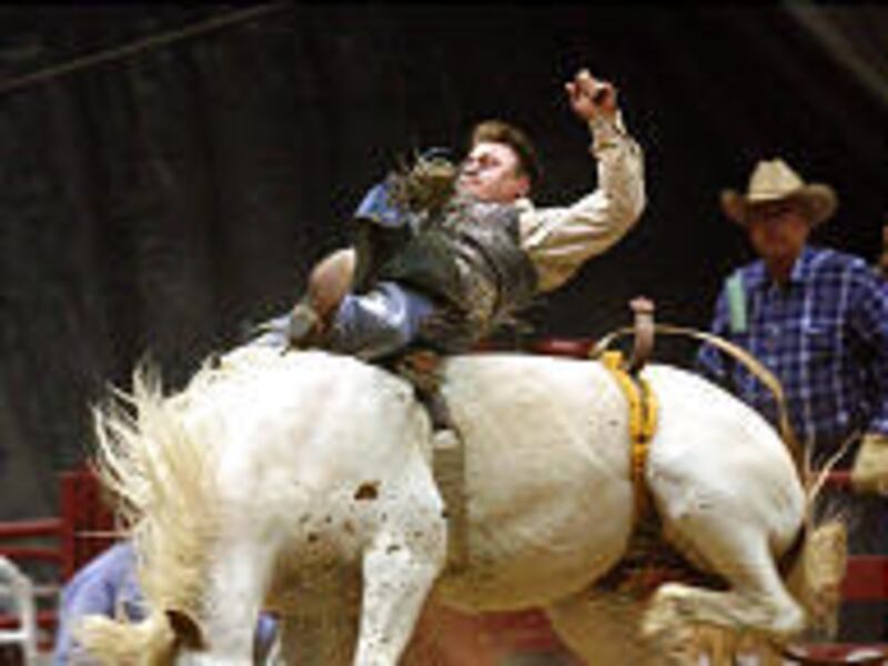 The first of seven rodeos attracted about 2,000 fans and featured some of the world's top rodeo athletes. The top score in bareback riding was also an 85, earned by Tyson Thompson, of Templeton, Calif. He didn't need any help getting his adrenaline pumping as he got to the rodeo just 15 minutes before his event started.