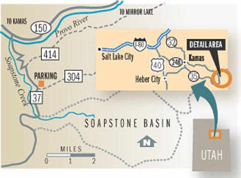 It was not the kind of weather that invited a picnic in the snow. We pretty much kept moving, from the moment we got out of the car in the parking lot for Forest Road 37. (Also known as the Soapstone Basin Road, it can be found about 15 miles past Kamas on the Mirror Lake Highway.) We skied past the cabins of the YWCA Camp Rogers and up along the snowpacked byways, enjoying the views, waving to snowmobilers, but never pausing long enough to start freezing. We kept moving for two miles, until we got to the unmarked turnoff for Forest Road 414.