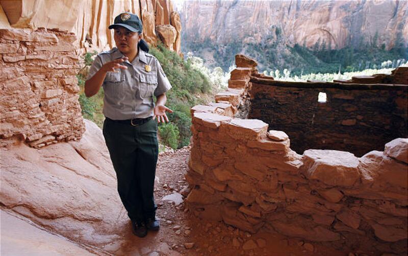 NAVAJO NATIONAL MONUMENT — On a crisp, fall-like Saturday morning, Cassandra Parrish leads five hikers into a deep, salmon-to-red tinted canyon south of the Arizona-Utah border. Their goal is Betatakin, an ancient pueblo nestled precariously inside a stunningly cavernous grotto.
