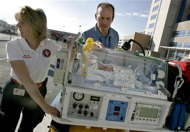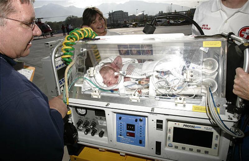Families of the incoming babies took turns lining up for pictures just off the helipad. Chris and Shantel Conradi of Bountiful said hospital staff gave them a tour of the new facilities several days ago and then called this morning to tell them when their baby girl, Capreis, was scheduled to arrive. Jet wash from the arriving helicopter blew tears from their cheeks as they photographed Capreis' arrival. "I was supposed to deliver here," Shantel said, "in December." But Capreis instead was born eight weeks early at LDS Hospital, which put the family among the group making today's transfer.