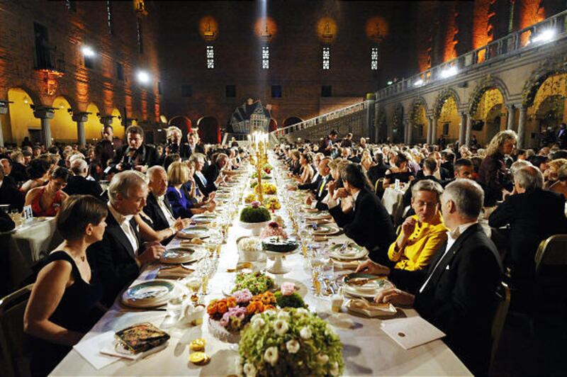 STOCKHOLM, Sweden — Alfred Nobel was reportedly an unpretentious man, but the party thrown to honor the Nobel Prize recipients is straight out of a fairy tale: A royal family, thousands of flowers from Italy, music by a renowned orchestra and a noted soprano, all watched by an international cast of bit players, the men wearing tuxedos and the ladies in evening gowns.