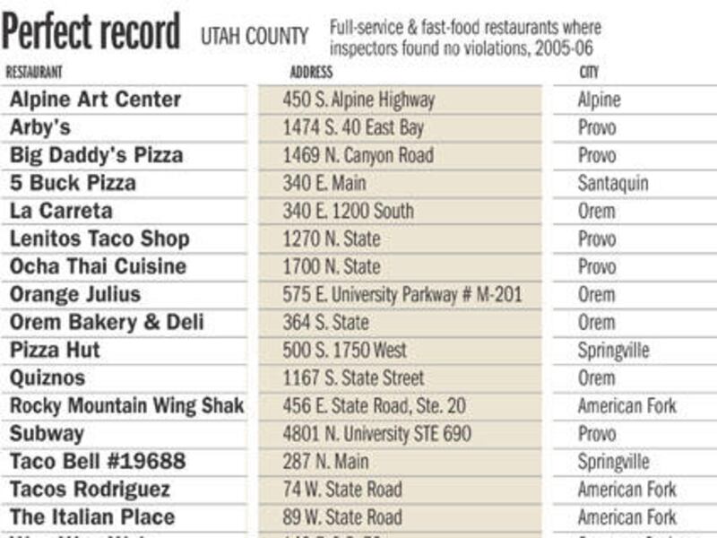 In Utah County, 17 full-service and fast-food restaurants had perfect scores in all inspections, according to records (see chart).