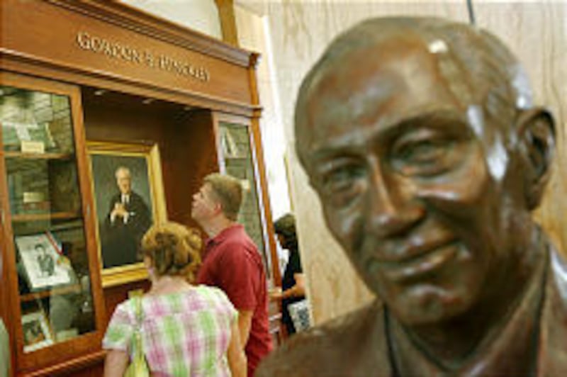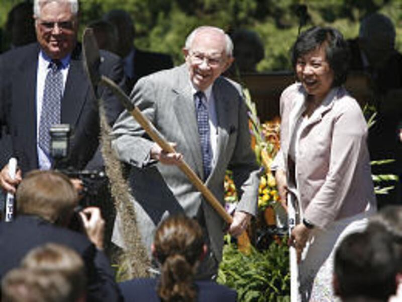 President Hinckley spoke — "Now," he joked when he mentioned the hearing aid and pacemaker, "as I creep into old age ..." — and Elder Richard G. Hinckley of the Quorum of the Seventy gave the prayer dedicating the new Gordon B. Hinckley Alumni and Visitors Center to "the (BYU) alumni who have gone over the world and brought honor to this church."