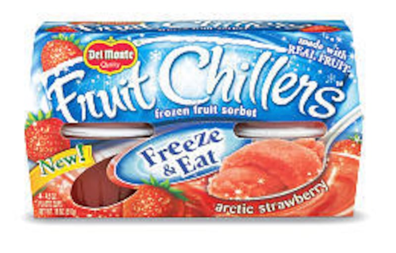 Bonnie: Fruit Chillers are fruit puree in a sealed cup that turn into sorbet when you freeze them overnight. This freeze-and-eat concept dates back to those liquid pops in plastic tubes like Fla-Vor-Ice. Del Monte does it LOTS better.