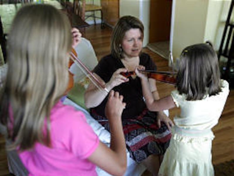 All six of their kids are musicians, and some play more than one instrument. There are two pianists, three violinists and a guitarist. Though her daughters take violin lessons from an instructor, Driggs says she tries to spend time practicing with them every day.