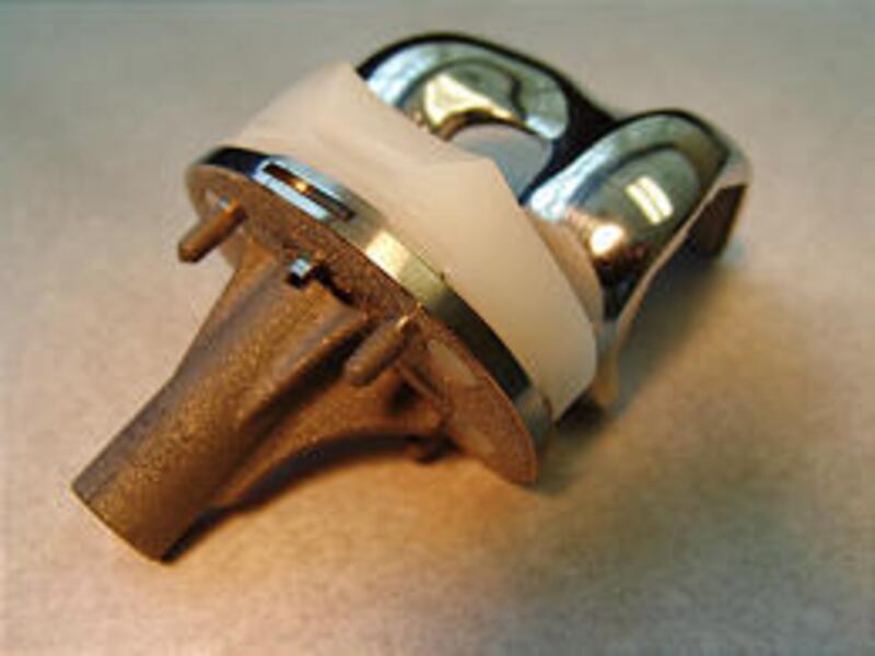 Two years ago this month, Rasmussen implanted Wright Medical's ADVANCE Medial-Pivot Total Knee System, which has three parts: a titanium platform with a stem that goes into the lower bone, a cap made of cobalt chromium metal that goes over the curve of the femur's end and a polyethylene plastic liner that sits on the platform.