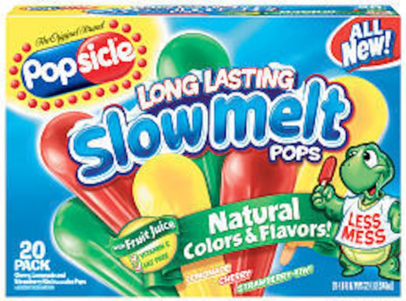 Popsicle Slow Melt Pops. Cherry, Lemonade and Strawberry-Kiwi. $3.99 per 32-ounce variety box containing 20 1.6-ounce pops.