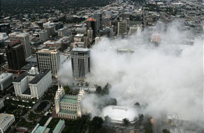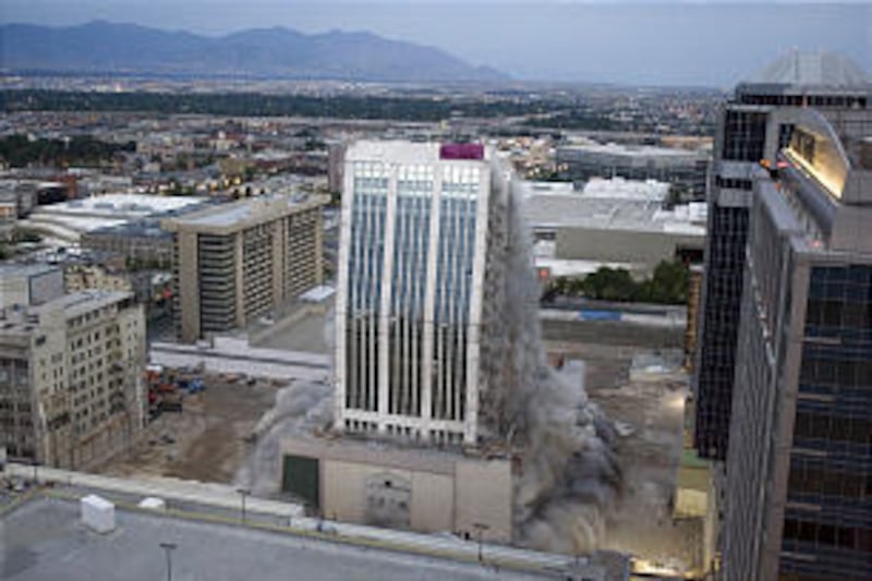 Boom ... boom ... boom, then a pause, and finally, a skyscraper that has been part of the Salt Lake City skyline for almost 30 years met its end early this morning.